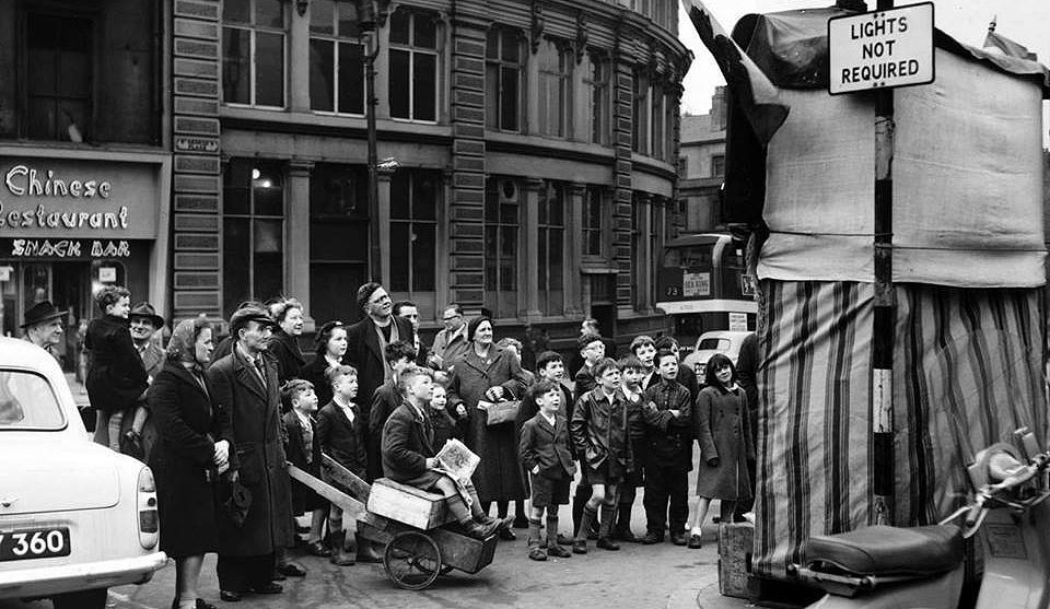 This photographs shows the Reverend Brown watching a Punch & Judy show on Lime Street in 1957.