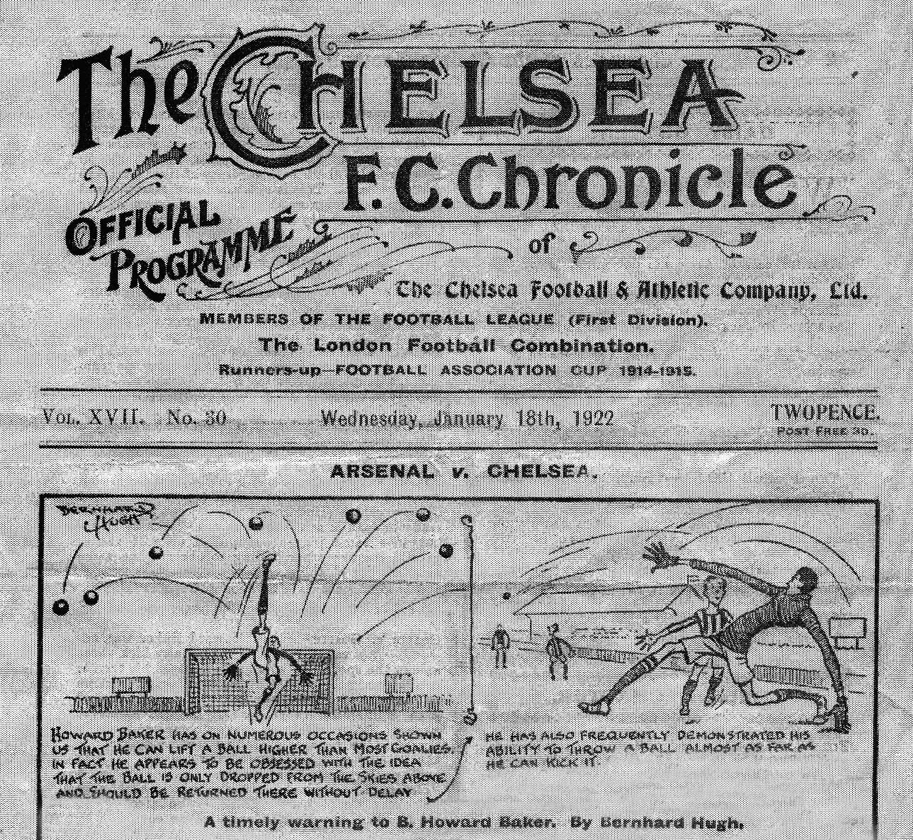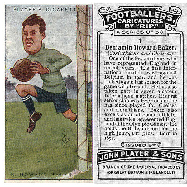 In 1921 Baker signed for Chelsea, playing 92 times for them often before 60,000+ at Stamford Bridge. He was a great favourite with the fans who much admired his acrobatic ability in goal. He was known and liked however well beyond Chelsea, The Times often reporting on his goalkeeping antics.