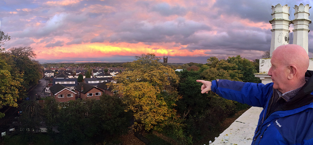 | Alastair Caird pointing out from the roof of Lowlands the houses built on the site of the school. |