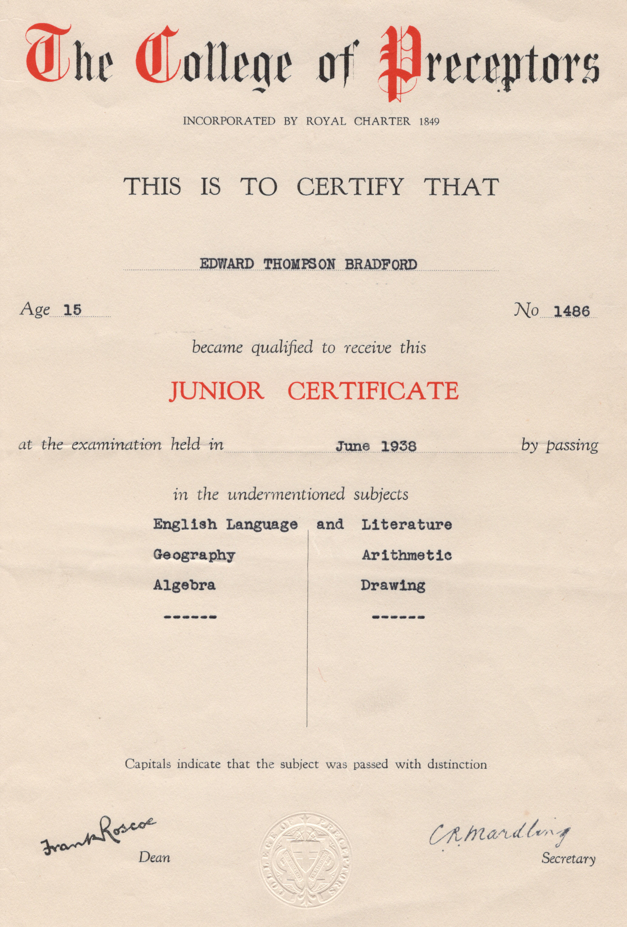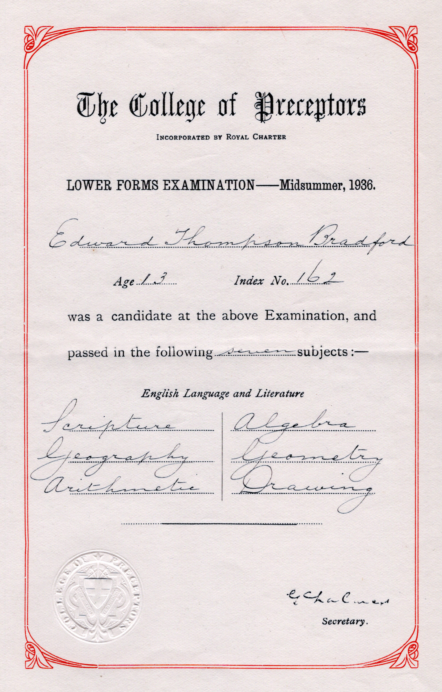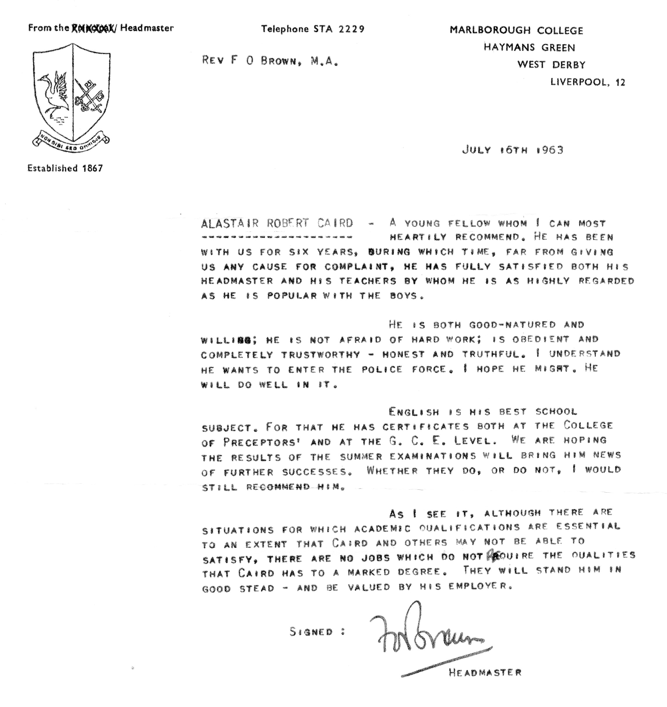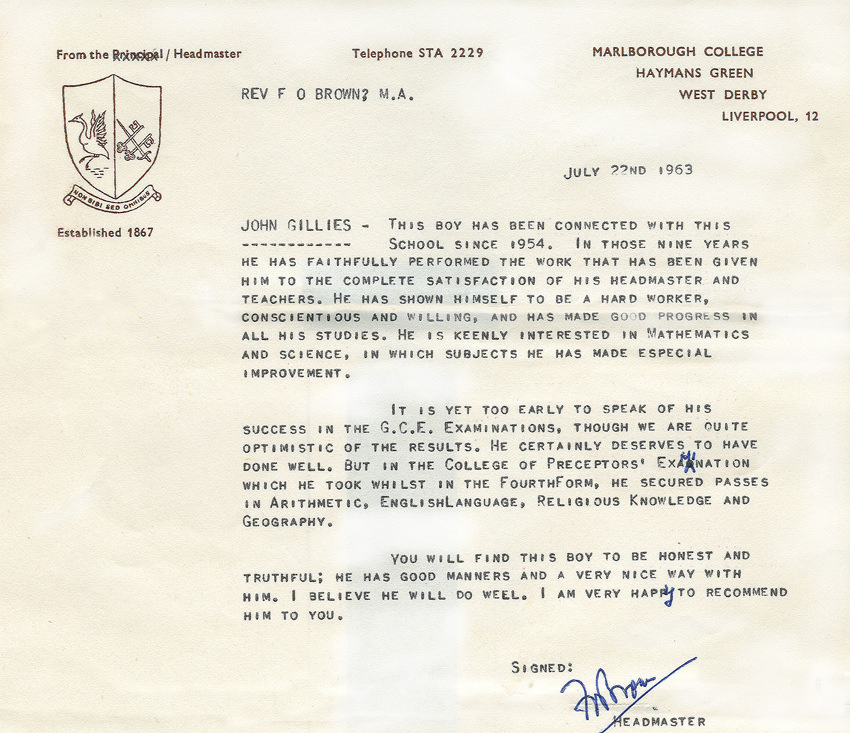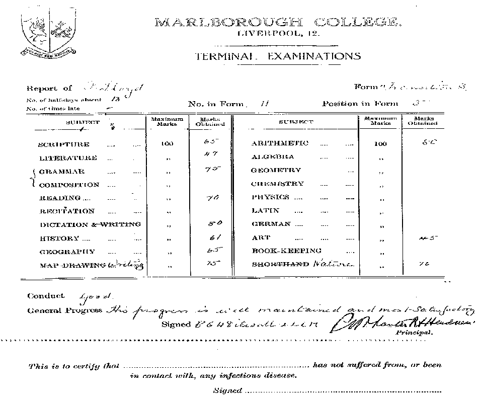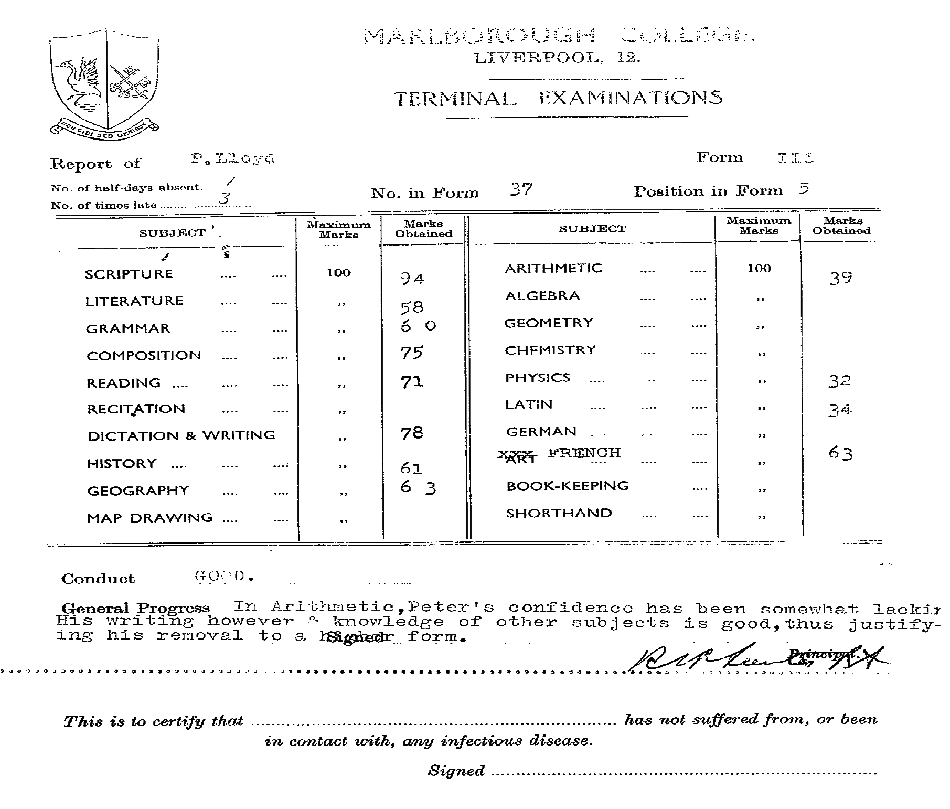 The last lesson he had at MC was Geometry on Fri afternoon 12.7.63 with Mr Brown.